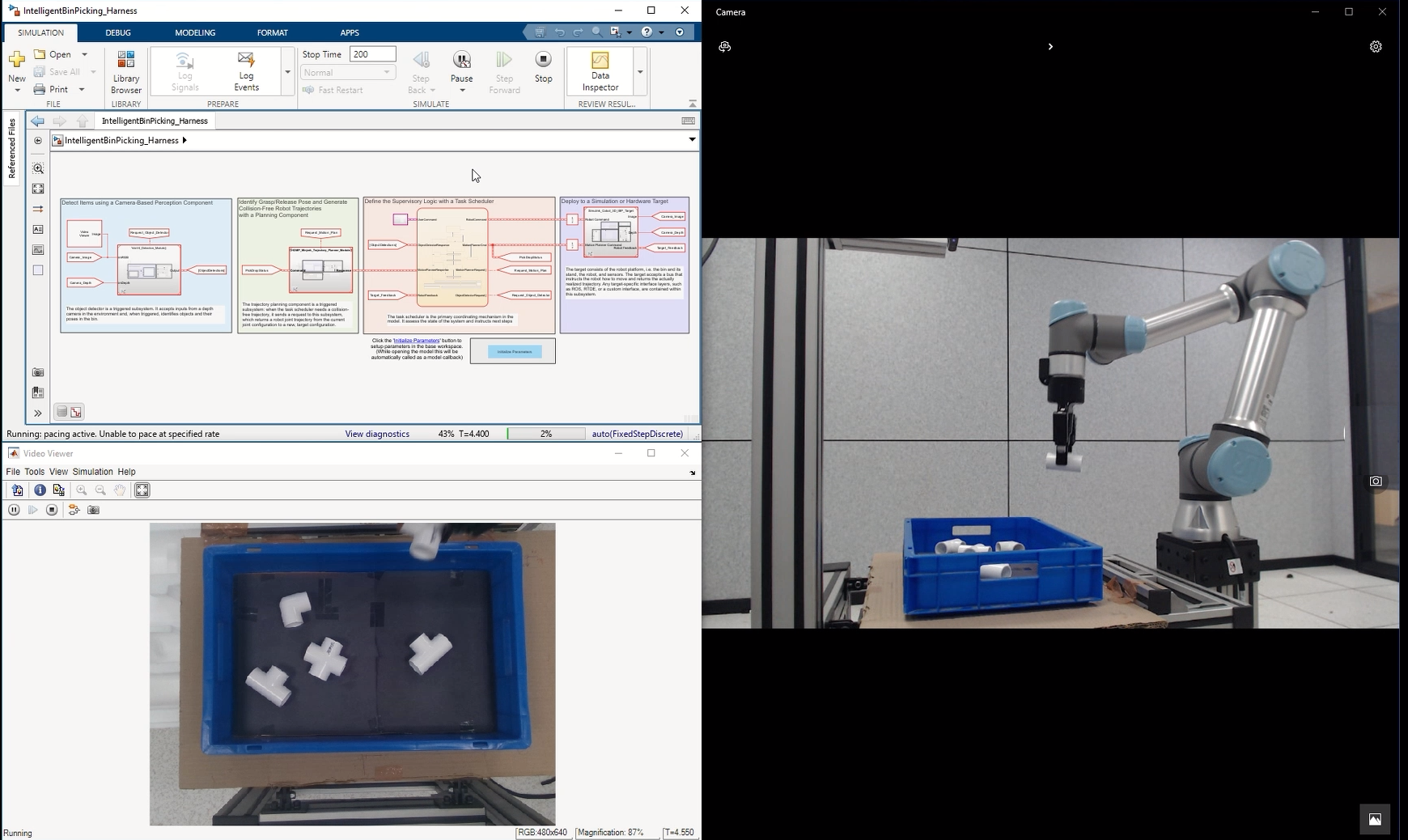 After opening the IntelligentBinPicking_Harness model, click Run to simulate intelligent bin picking in URSim and Unreal Engine. This is achieved using these referenced models: