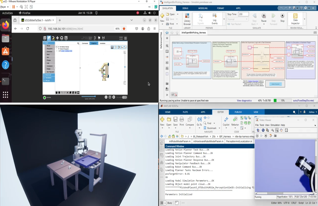 Open the IntelligentBinPicking_Harness.slx model that uses the updated target environment (URSim offline simulator). If the model is already open (as part of Workflow 1 described in Intelligent Bin Picking System in Simulink example), close and re-open the model again so that it uses the updated target environment.