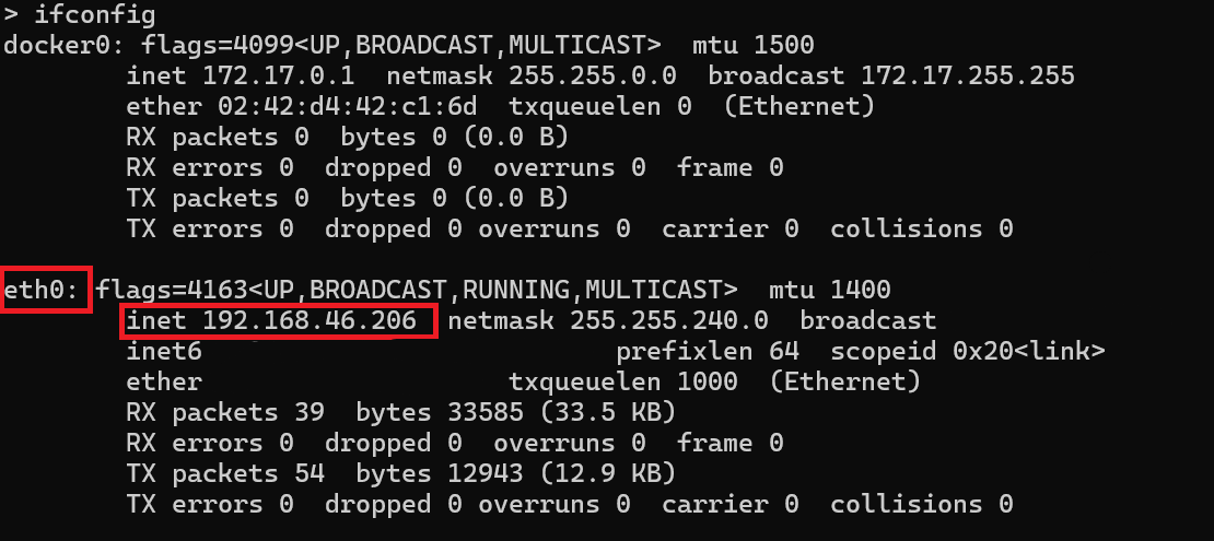 While the Docker container is running, obtain the IP address of the Docker container running on the linux device. This IP address is necessary for establishing an SSH connection and later deploy the bridge node from Simulink. Note that the IP address of the Docker container is the same as the IP of the host machine.