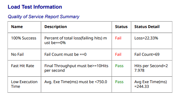 test(1).Name = "100% Success"; test(1).Description = "Percent of total loss(failing hits) must be==0%"; test(1).Status = "Fail"; test(1).StatusDetail = "Loss=22.33%"; test(2).Name = "No Fail"; test(2).Description = "Fail Count must be ==0"; test(2).Status = "Fail"; test(2).StatusDetail = "Fail Count=69"; test(3).Name = "Fast Hit Rate"; test(3).Description = "Final Throughput must be>=10Hits per second"; test(3).Status = "Pass"; test(3).StatusDetail = "Hits per Second=27.978"; test(4).Name = "Low Execution Time"; test(4).Status = "Pass"; test(4).Description = "Avg. Exe Time(ms) must be <750.0"; test(4).StatusDetail = "Avg Exe Time(ms)=244.33";