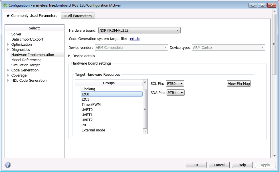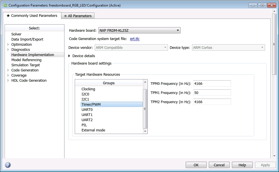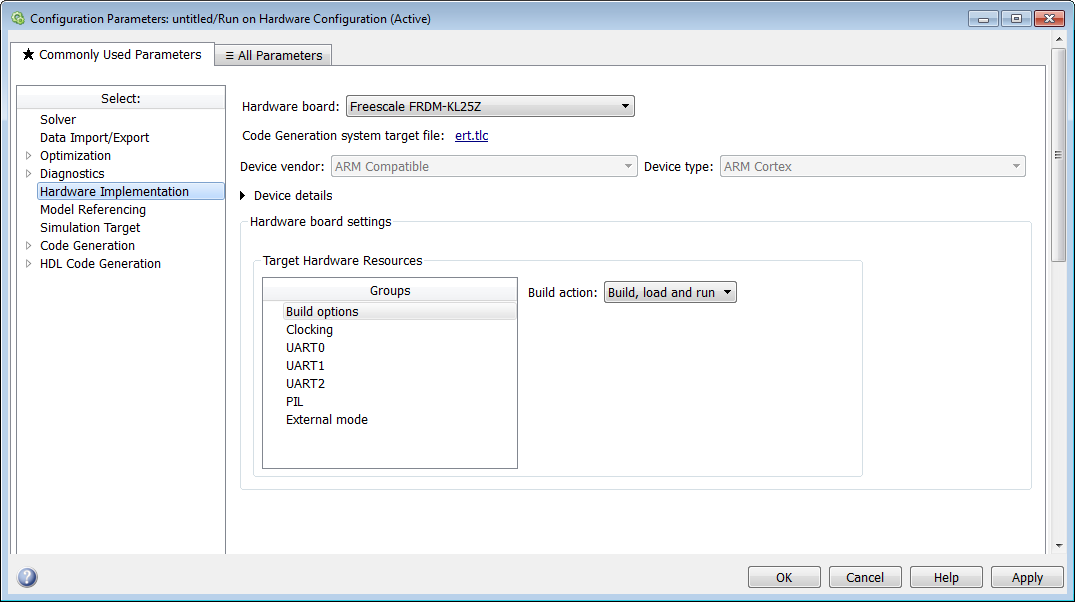 Changing this parameter updates the Configuration Parameters dialog box so it only displays parameters that are relevant to your target hardware.
