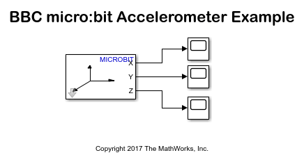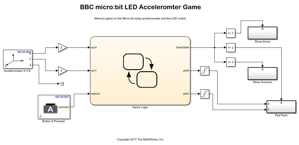 The Simulink® Coder Support Package for BBC micro:bit board provides blocks that represent the 5x5 LED matrix and the accelerometer sensor. In this example, you learn about a Simulink model that is designed to be a game for the BBC micro:bit board. This Simulink model performs the following functions: