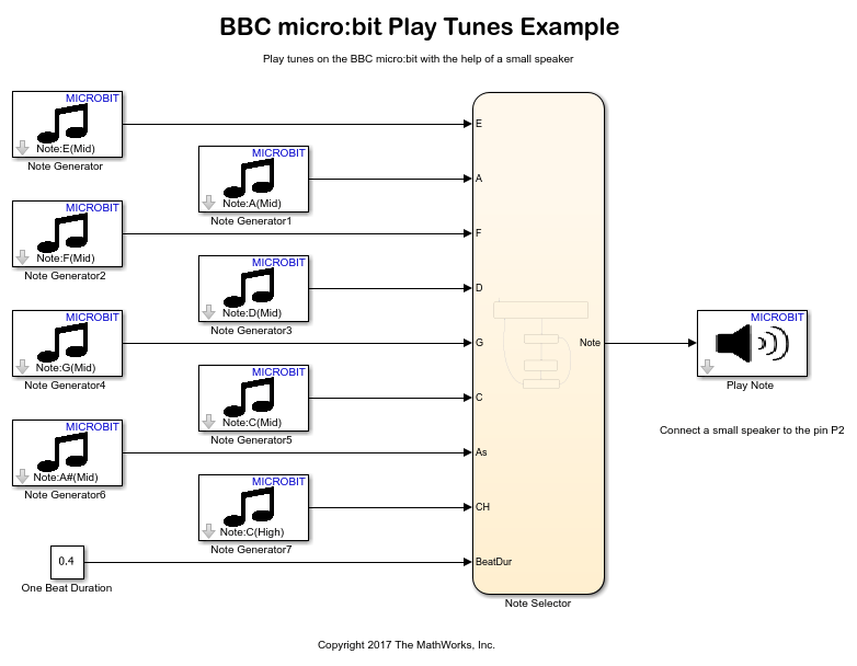 The Simulink® Coder Support Package for BBC micro:bit provides Audio blocks that help you to generate musical notes and play them.