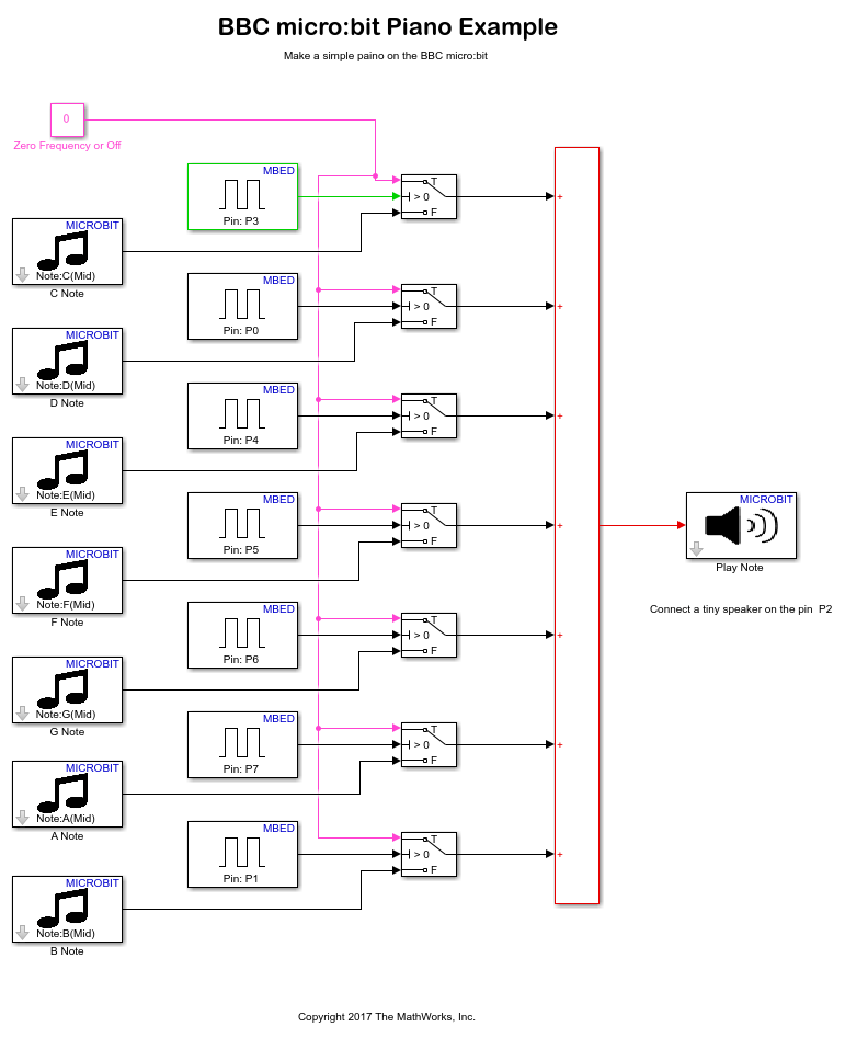 The Piano Simulink model maps the pins on the BBC micro:bit to particular notes, and a note is played if you short the pin to the GND (ground) pin.