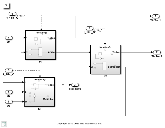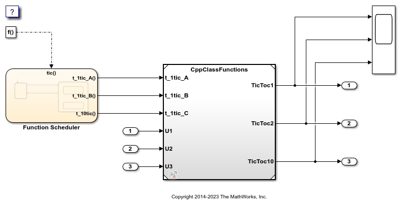模型 CppClassFunctions 包含用于导出函数的函数调用子系统 f1、f2 和 f3。