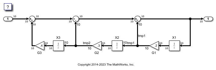 在模型 rtwdemo_VectorOptimization 中,Gain 模块 G1 和 G2 的输出是向量信号 tmp1 和 tmp2。这些向量的宽度为 10。