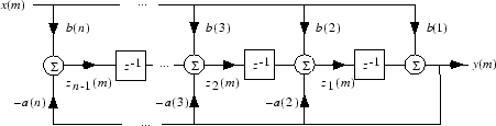 filter 实现为转置的直接 II 型结构,其中 n–1 是滤波器的阶。这是一种具有最少延迟元素的标准形式。