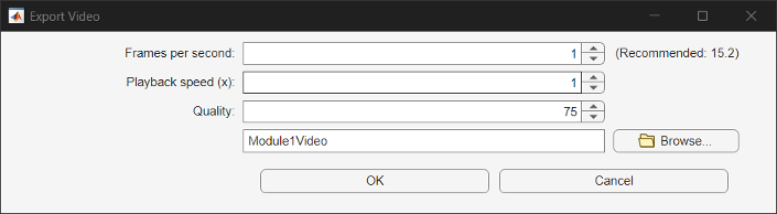 To export the dynamic version of the battery chart as an AVI file, click the Save video button in the container window to open the Export Video window. This window allows you to specify the frames per second, playback speed, and quality of the exported video.