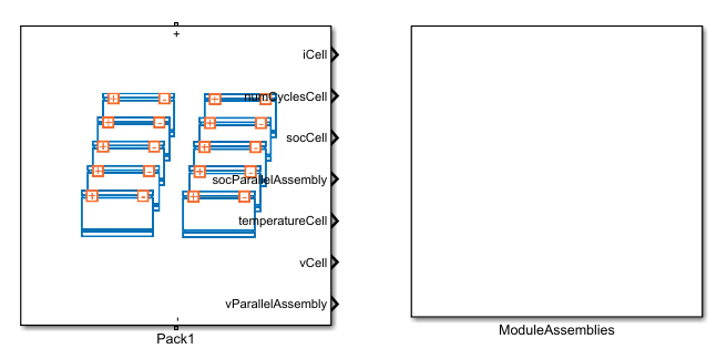 您的 ModuleAssembly 和 Pack 对象的 Simscape 模型是子系统。打开 packLibrary SLX 文件并双击子系统,即可查看这些子系统的内部情况。