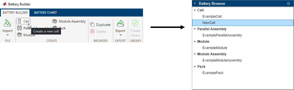 为了反映现实世界中的行为,Simscape Battery™ Cell 对象是创建电池包系统模型的基础元素。要创建一个 Cell 对象,在工具条的电池构建器选项卡下的创建部分中,选择电芯。