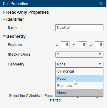 NewCell对象。现在,App 右侧的属性面板显示了其所有属性。在右侧的电芯属性面板中,在几何形状部分,将