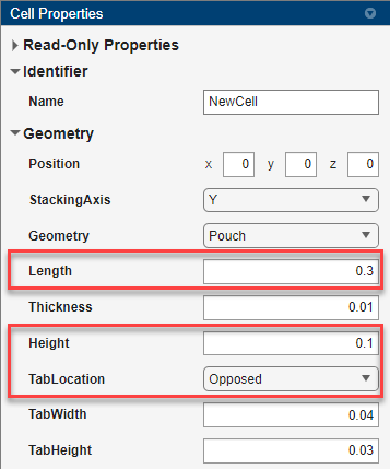 在此示例中,您将创建一个高度为 0.1 米、长度为 0.3 米、带有相对选项卡的软包电芯。在电芯属性面板的几何形状部分,相应地编辑 Length、Height 和 TabLocation 属性。