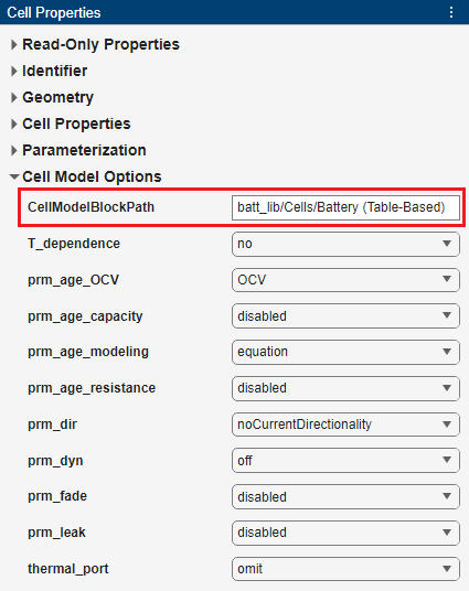 默认情况下,Cell 对象使用 Battery (Table-Based) 模块作为 Simscape 电芯模型模块。然后,在电芯模型选项部分中的属性定义了控制电芯模块组件成员(如参数、变量、节点、输入和输出)可见性的条件参数。有关默认 Battery (Table-Based) 模块的这些条件参数的详细信息,请参阅 BlockParameters。