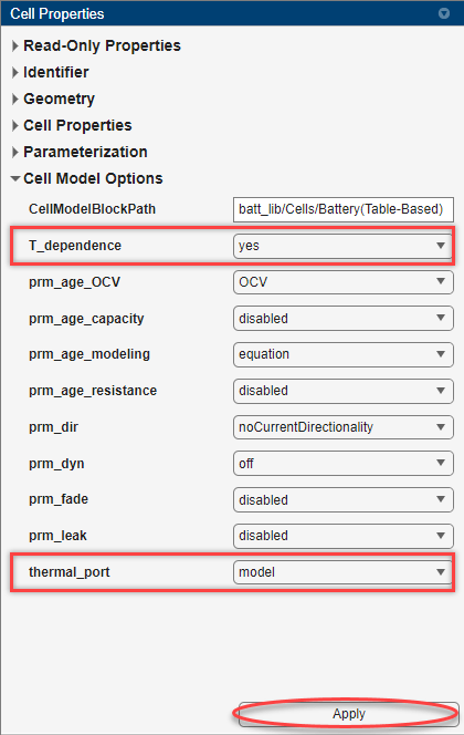 您还可以使用简单的一维模型对电池电芯的热效应进行仿真。在电芯属性面板中,展开电芯模型选项部分。此部分中的属性取决于您在 CellModelBlockPath 属性中指定的电芯模块。电池构建器将您正在定义的电池 Cell 对象与用于 Simscape 仿真的 Simscape 电芯模型模块链接起来。Simscape 电芯模型模块可以是 Battery (Table-Based) 模块、Battery Equivalent Circuit 模块或具有特定要求的自定义模块。