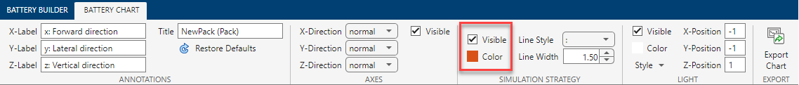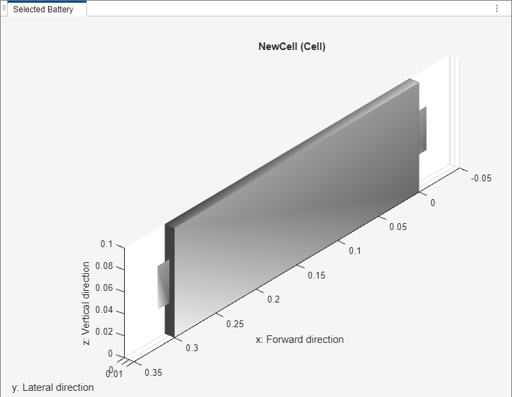 电池图 - 包含三维电池图显示选项的选项卡。在此选项卡中,您可以编辑属性,例如轴标签、轴方向、图标题和灯光。您还可以检查所选电池对象的当前仿真策略和模型分辨率。