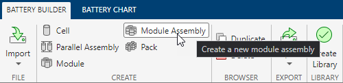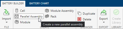 要创建 ParallelAssembly 对象,在工具条的电池构建器选项卡下的创建部分中,选择并联组件。