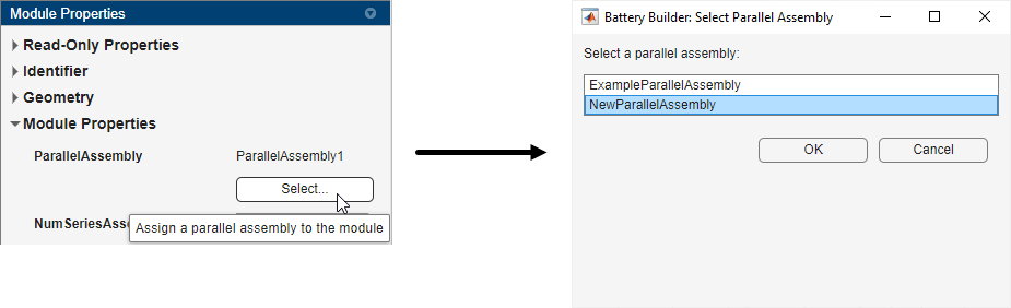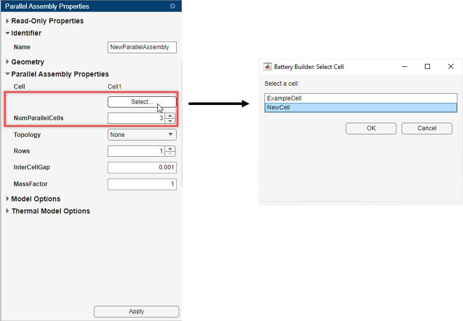 NewCell 对象现在是该并联组件的子组件(或子组件)。应用更改后,您可以在电池层次结构面板中查看 ParallelAssembly 对象的层次结构。