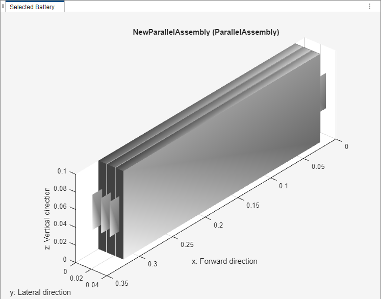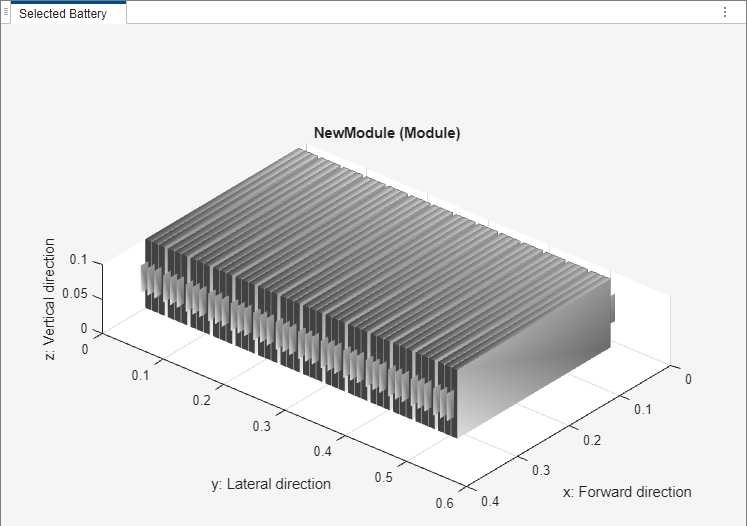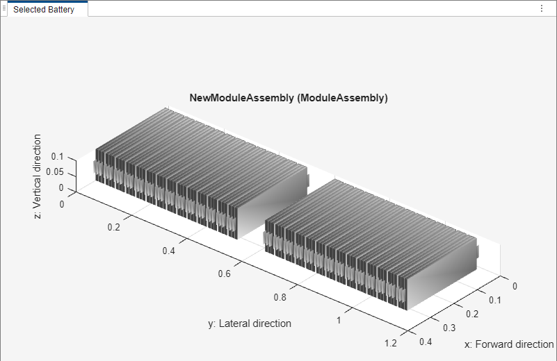 电池模组组件由串联或并联的多个电池模组组成。在此示例中,电池模组组件由两个相同的模组组成,每个模组之间的间隙为 0.1 米。默认情况下,ModuleAssembly 对象将模组电连接成串联。