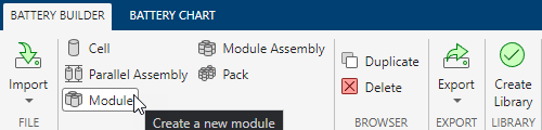 要创建 ModuleAssembly 对象,在工具条的电池构建器选项卡下的创建部分中,选择模组组件。