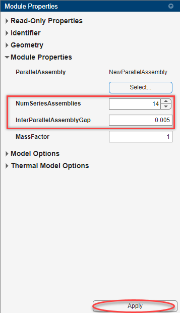在此示例中,该模组由 14 个并联组件组成,每个组件之间的间隙为 0.005 米。在模组属性面板的模组属性部分下方,将 NumSeriesAssemblies 属性设置为 14,并将 InterParallelAssemblyGap 属性设置为 0.005。