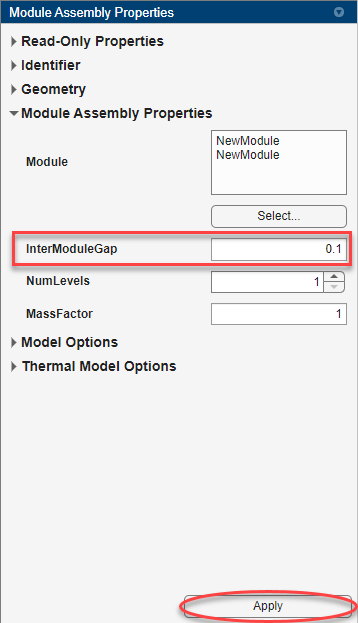 现在指定模组之间的间隙。在模组组件属性面板的模组组件属性部分,将 InterModuleGap 属性设置为 0.1。