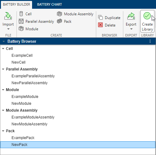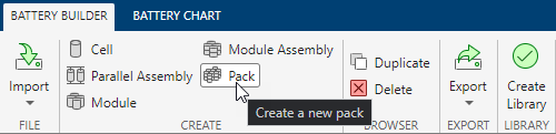 要创建一个包含在此示例中创建的 Pack 对象的 Simscape Battery 模型的库,在电池浏览器面板中,选择 NewPack 对象。然后,在电池构建器选项卡下,在工具条的库部分,选择创建库。