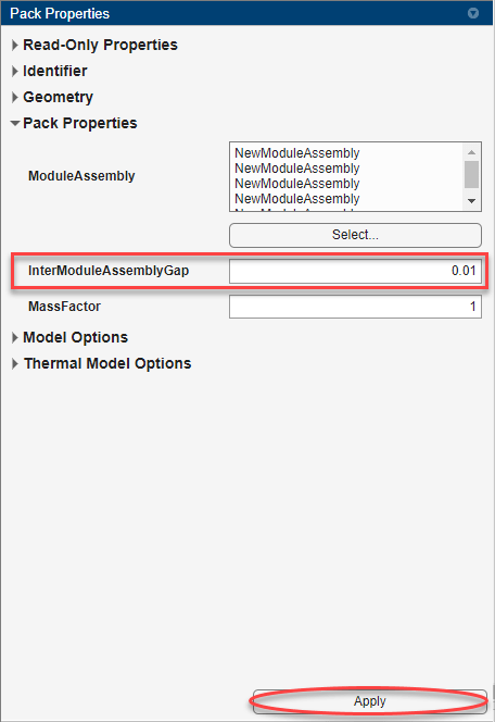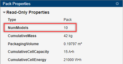 要获得打包仿真使用的 Simscape Battery (Table-Based) 模块的数量,在打包属性面板的只读属性部分中,查看 NumModels 属性。