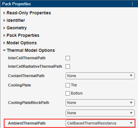 要定义通向环境空气的热路径,在包属性面板的热模型选项部分中,将 AmbientThermalPath 属性设置为 CellBasedThermalResistance。您设置的值会自动传播到该 Pack 对象中的所有子组件电池对象。但是,这一更改不会传播到电池构建器会话中的其他电池对象。