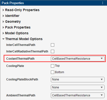 要定义从电芯到冷却液的热路径,在电池组属性面板的热模型选项部分,将 CoolantThermalPath 属性设置为 CellBasedThermalResistance。您设置的值会自动传播到该 Pack 对象中的所有子组件电池对象。但是,这一更改不会传播到电池构建器会话中的其他电池对象。