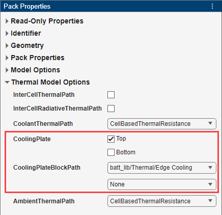 对于 Pack 对象,您可以通过分别指定 AmbientThermalPath、CoolantThermalPath 和 CoolingPlate 属性来定义到环境空气、冷却液和冷却板的位置的热路径。