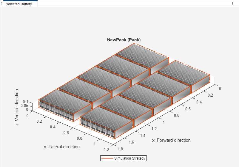 现在,在选定的电池面板中的三维图显示了 Pack 对象的仿真策略。该电池组为每个模组使用一个电气模型。