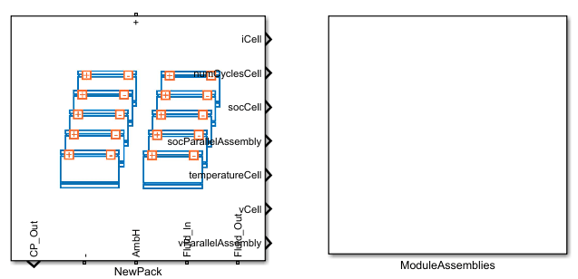 要创建电池包的系统模型,必须先创建构成电池包的 Cell、ParallelAssembly、Module 和 ModuleAssembly 对象。根据规格创建电池包后,您可以构建电池包,在工作文件夹中生成一个库,该库包含此电池包的系统模型模块。您可以在仿真中将此系统模型用作参考。