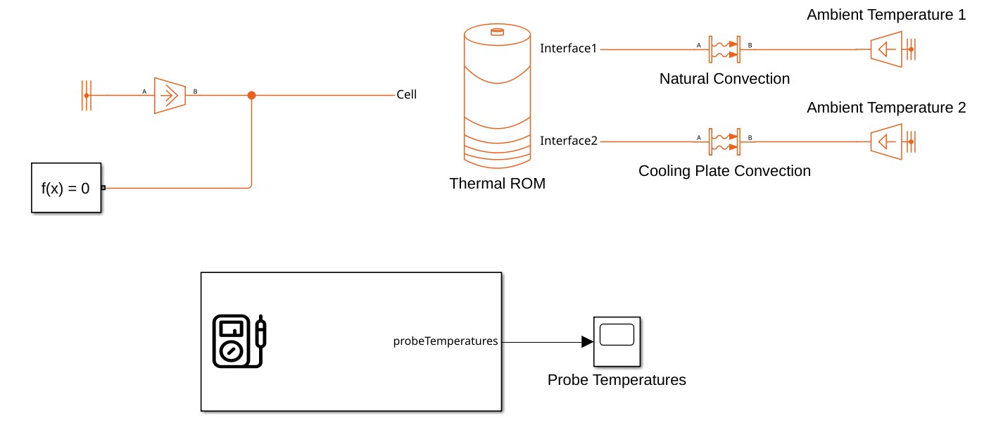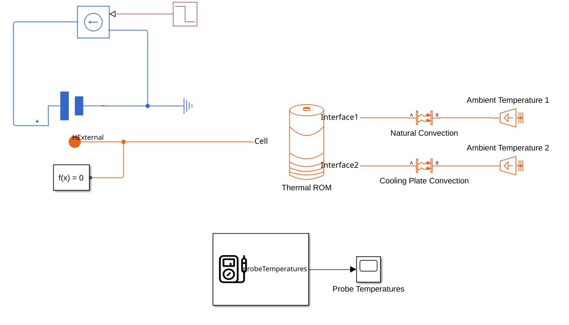 To use the Thermal ROM block together with an electrical cell model, the electrical block must expose a scalar thermal node for coupling to the thermal model. The electrical block reads the temperature at this node to compute its electrical behavior and injects the corresponding heat generation back into the same thermal node.