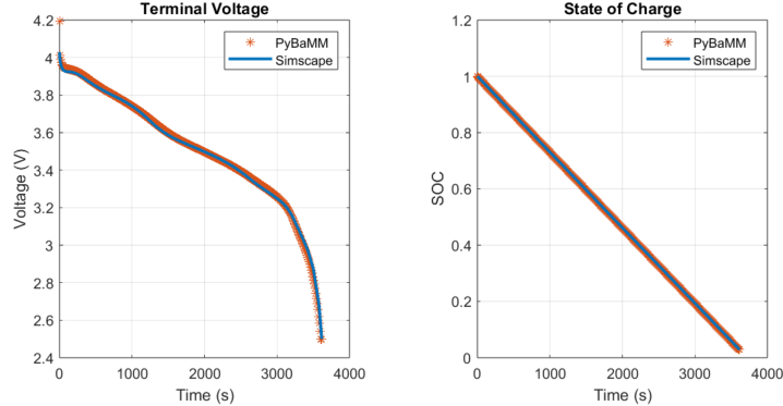 To verify the DFN model equations, compare the output voltage and the state of charge of the BatteryDFN block against the output of an open-source DFN model implemented in the Python Battery Mathematical Modelling (PyBaMM) package. PyBaMM is a leading open-source battery electrochemical modeling tool, making it a reliable reference for comparison. These plots show a 1C discharge rate using a PyBaMM default parameter set.