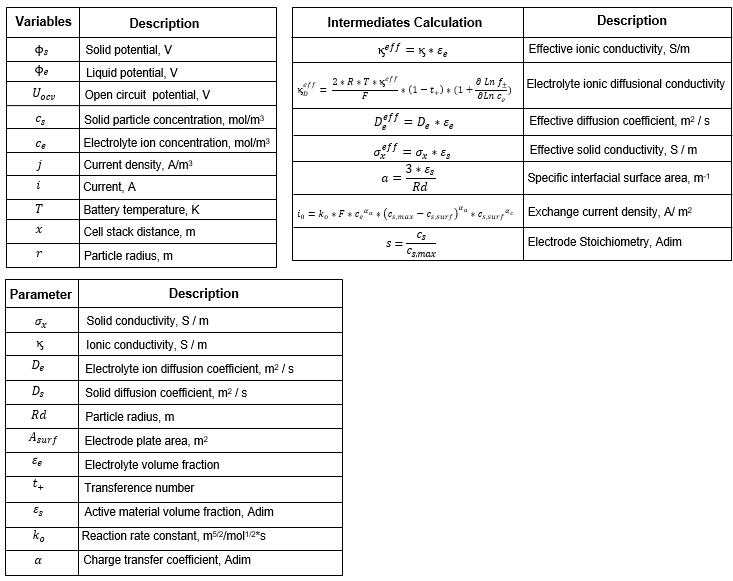 These tables contain additional information about the variables, parameters, and intermediate calculations of the BatteryDFN block.