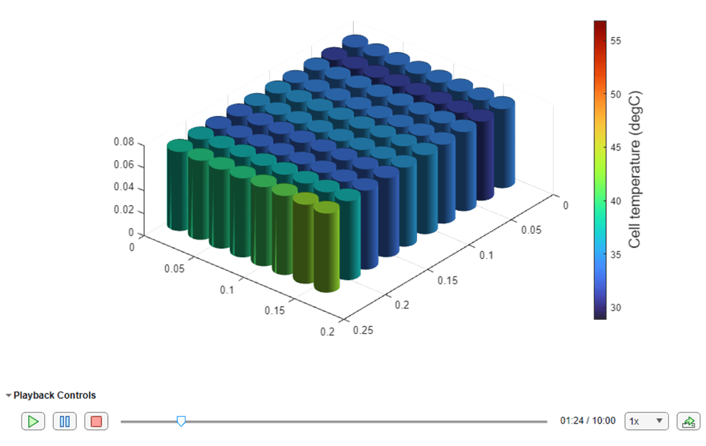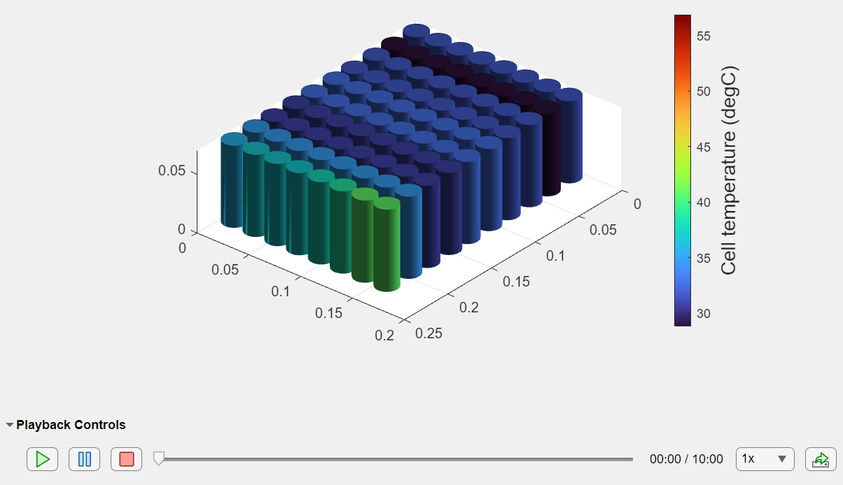 f = uifigure(Color="w"); g = uigridlayout(f,[1 1]); packChart = batterySimulationChart(g,batterySimLog); packChartColorBar = colorbar(packChart); ylabel(packChartColorBar, strcat("Cell temperature"," (",batterySimLog.SelectedVariableUnit,")"),FontSize=14);