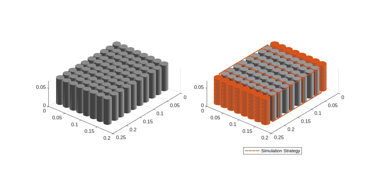 groupedModule1 = batteryModule(parallelAssembly,2, ... SeriesGrouping=[1 1], ... ParallelGrouping=[8 1], ... InterParallelAssemblyGap=simscape.Value(0.005,"m"), ... StackingAxis="X"); groupedModule2 = batteryModule(parallelAssembly,2, ... SeriesGrouping=[1 1], ... ParallelGrouping=[1 8], ... InterParallelAssemblyGap=simscape.Value(0.005,"m"), ... StackingAxis="X"); lumpedModule = batteryModule(parallelAssembly,2, ... InterParallelAssemblyGap=simscape.Value(0.005,"m"), ... StackingAxis="X");