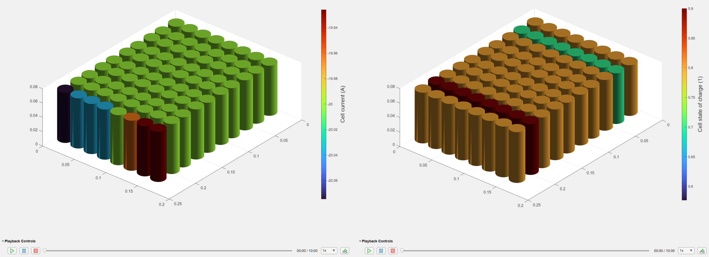 f = uifigure(Color="w"); g = uigridlayout(f,[1 2]); packCurrentChart = batterySimulationChart(g,batteryCurrentSimLog); packCurrentChartColorBar=colorbar(packCurrentChart); ylabel(packCurrentChartColorBar,strcat("Cell current"," (",batteryCurrentSimLog.SelectedVariableUnit,")"),FontSize=14); packCurrentChartColorBar = colormap(packCurrentChart); packStateOfChargeChart = batterySimulationChart(g,batteryStateOfChargeSimLog); packStateOfChargeChartColorBar = colorbar(packStateOfChargeChart); ylabel(packStateOfChargeChartColorBar,strcat("Cell state of charge", " (",batteryStateOfChargeSimLog.SelectedVariableUnit,")"),"FontSize",14 ); packStateOfChargeChartColorBar = colormap(packChart);
