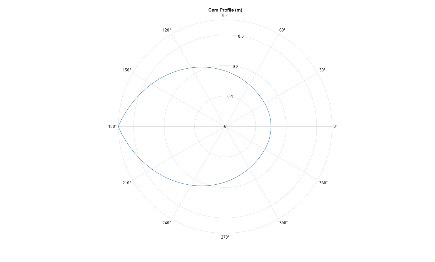 As the cam rotates, it has a constant radius of 0.15 m between -30 to 30 degrees. From 30 to 180 degrees, the radius increases parabolically from 0.15 m to 0.35 m, and from 180 to 330 degrees, the radius decreases parabolically back to 0.15 m. Below is a plot of the cam radius in polar coordinates.