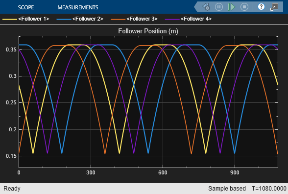 As expected from the cam profile, the cam followers undergo a parabolic rise phase, a dwell phase, and a parabolic fall phase, with positions ranging from 0.155 to 0.36 m. These positions correspond to the 0.5 m axle position minus the maximum and minimum lengths of the cam follower. The maximum and minimum lengths of the cam follower are slightly less than the 0.35 m and 0.15 m cam radii, respectively, due to the 0.05 m eccentricity.
