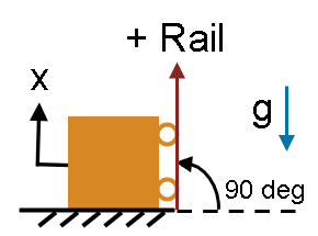 • If the rail points vertically upwards, θ=90deg, and a frictionless mass is accelerating downwards in free fall without any supports, then facc=f+fgp+ffriction reduces to facc=fgp, or equivalently, mx¨=-mg. That is, neither friction nor the system mechanical components exert force on the mass, f=ffriction=0.