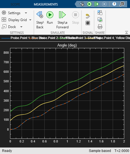 The theta variable at each block node tracks the simulated angle versus time. To initialize angles in a model, set the Relative angle variable in two-port blocks.