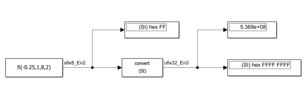如果选择存储的整数(SI),则模块不会对浮点输入信号执行较低级别的位重新解释。例如,如果输入为 single 且值为 5,则内存中存储该输入的位将通过下列命令以十六进制方式给出。