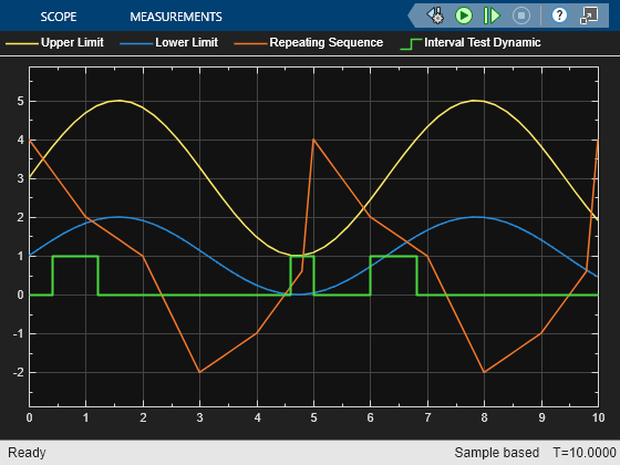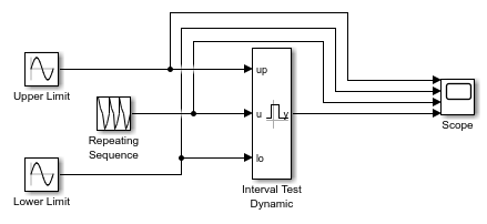 如果输入介于外部信号 up 和 lo 的值之间,则 Interval Test Dynamic 模块输出 true (1)。如果输入在这些值的范围之外,模块将输出 false (0)。要控制模块如何处理等于信号 lo 或信号 up 的输入值,请使用 Interval closed on left 和 Interval closed on right 复选框。