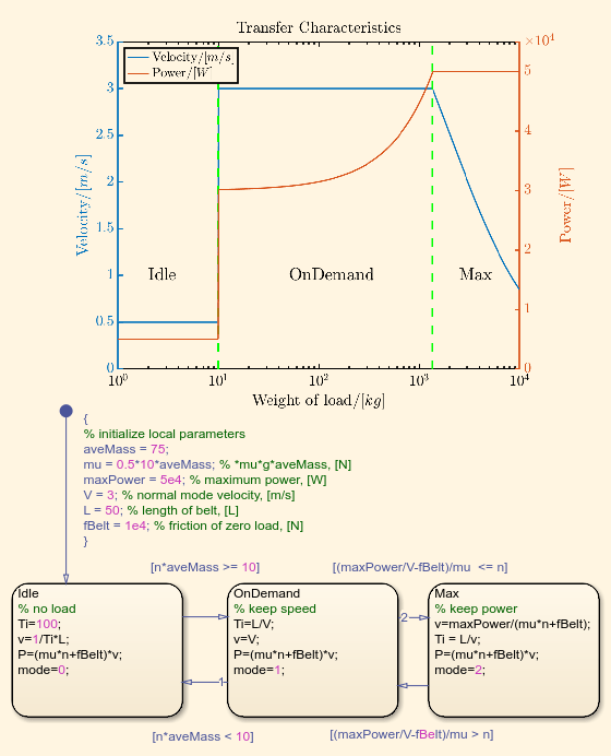 Stateflow® 图对变速传送带的动力学建模。请注意,图中皮带的速度和功率是相对于负载重量的对数刻度绘制的。传送带有以下几种模式: