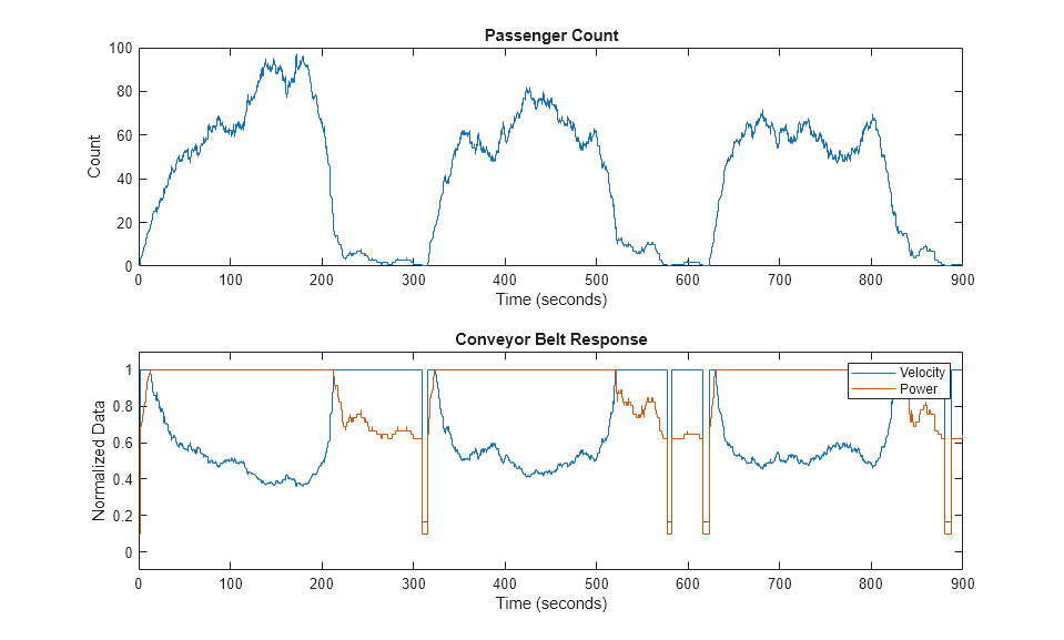 在 900 的时间跨度内观察到三个操作周期。每个周期为 300,与到达率的周期一致。上面的图显示了传送带上的乘客数量随时间的变化,下面的图显示了传送带的速度和功率。为了更好地进行可视化,速度和功率被标准化。