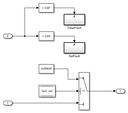Fault Handling 子系统设置和清除故障指示。每当算法实例遇到故障情况(控制器输入超过 2.63)时,子系统就会将数据存储的值增加 1。每次实例清除其故障条件(控制器输入小于 0.87)时,子系统就会将数据存储的值减少 1。