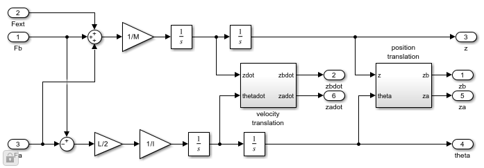 此示例显示如何对支撑连接两个液压作动器的大质量的刚性杆进行建模。该模型消除了弹簧,因为它将活塞力直接施加于负载。这些力与重力平衡,导致线性和旋转位移。
