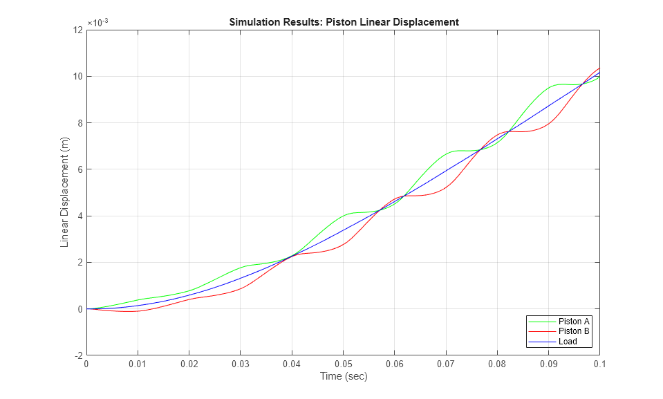 这些图显示了杆的线性和角位移。线性位移响应是第一类积分系统的典型特征。杆的相对位置和角运动说明了两个活塞对异相控制信号的响应,或者阀门 A 和 B 的横截面。