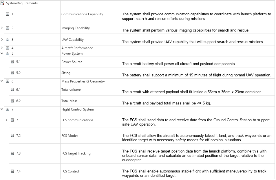 In this example, the system-level requirements that describe communication, UAV capability, and flight-control behavior are stored in SystemRequirements.slreqx. You can open the specification file in the Requirements Editor by double-clicking it in the project folder browser or using the Project Shortcuts. The Requirements Editor view below shows how this requirement is defined.